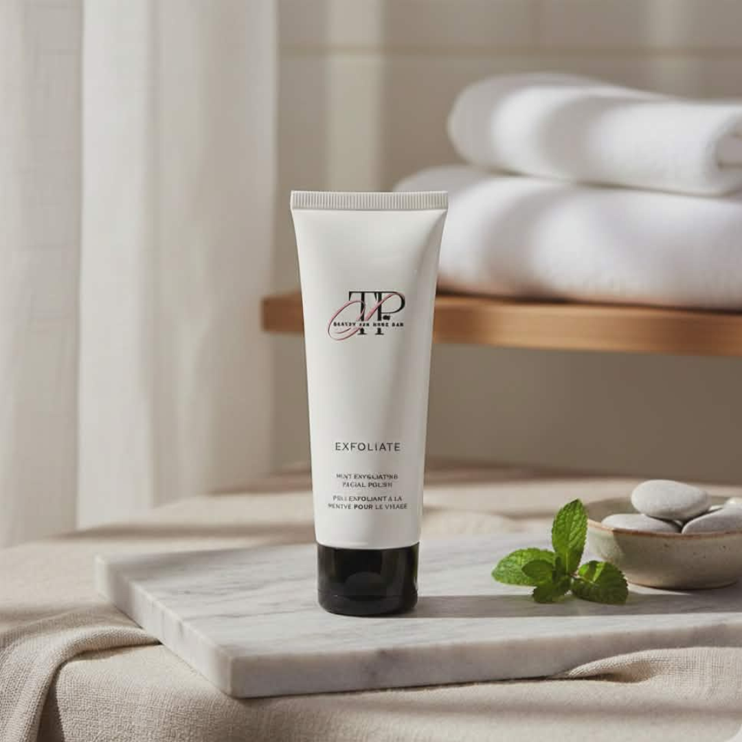Our Mint Exfoliating Facial Polish is a creamy, skin-softening exfoliant formulated with cellulose beads, aloe vera, green tea, and apricot oil to gently buff away dull, dry skin while maintaining moisture.